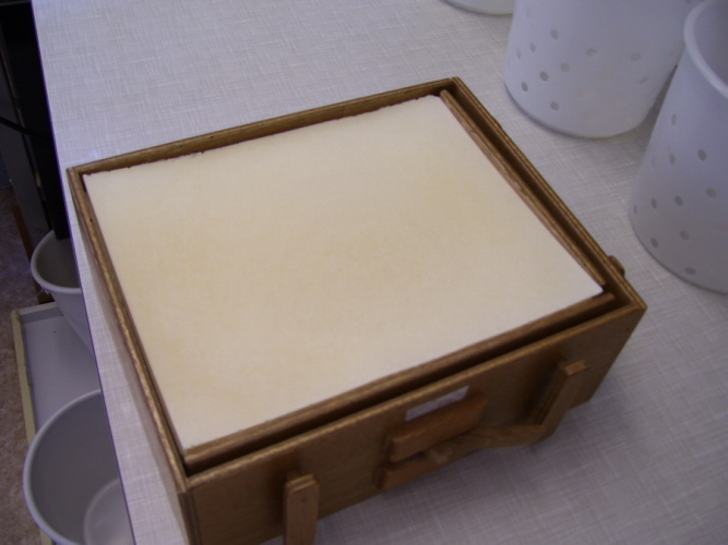 Dann werden sie in solchen Holzformen übereinandergelegt